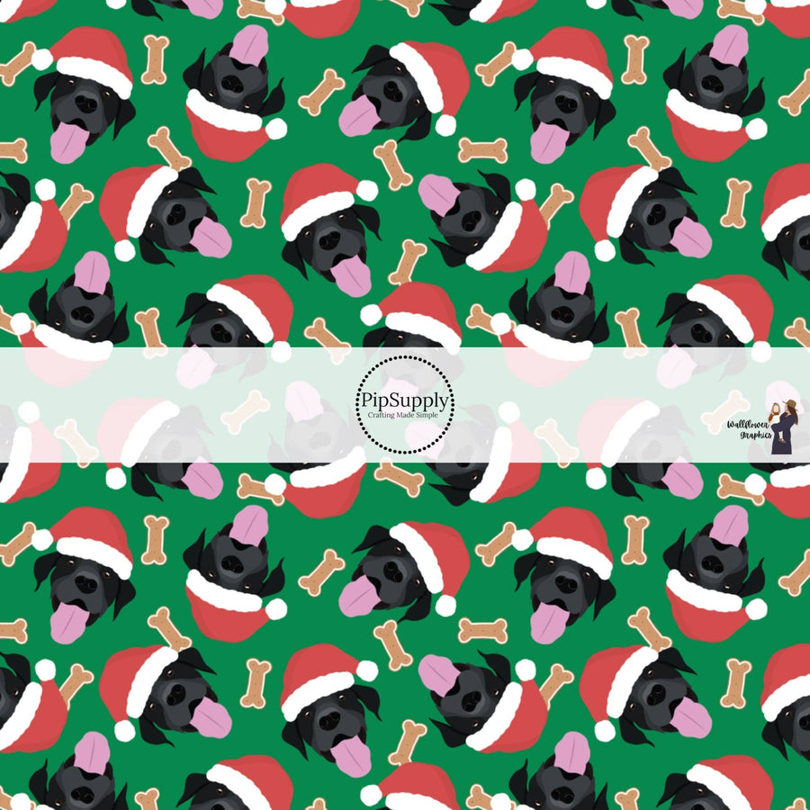 These holiday themed fabric by the yard features black lab dogs with Christmas hats surrounded by dog bone treats on dark green. This fun Christmas fabric can be used for all your sewing and crafting needs!