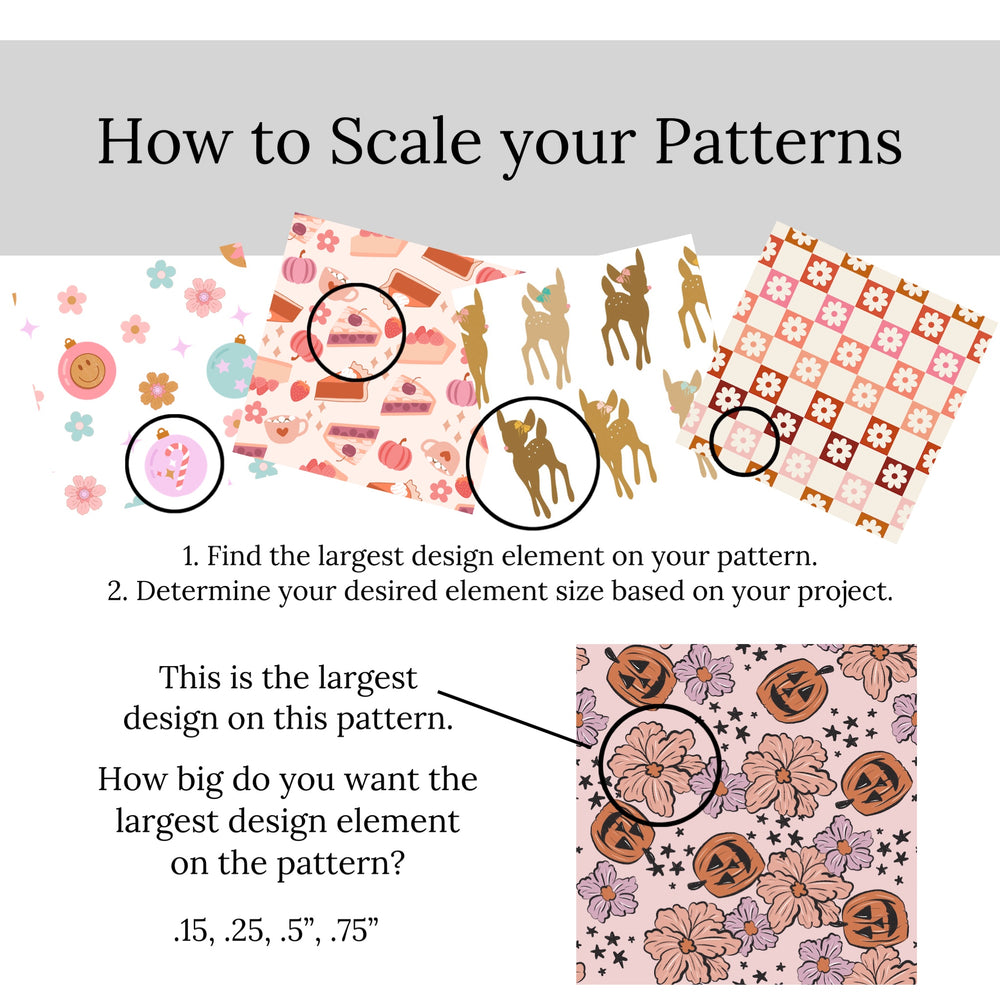 Step 2- Choose your desired pattern scaling. First, find the largest element in your pattern and enter the name of that element in the provided field. Next, enter the size you would like that element to be printed on your faux leather in the provided field. Express your measurement in inches (i.e. .25” .5” .75” etc). *See product pictures for our sizing recommendations.