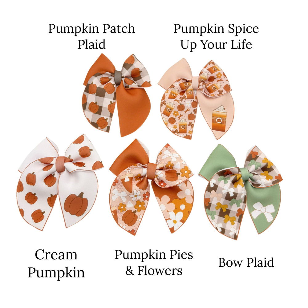 These Fall pumpkin pie and coffee neoprene sailor bows can be quickly cut and assembled for a trendy seasonal bow. They're ideal for easy at-home styling, individual use, or even resale. These bows contain designs of fall flowers, pumpkins and lattes. Get creative and add a splash of color to your look with these low-maintenance bows – perfect for Fall and Autumn!