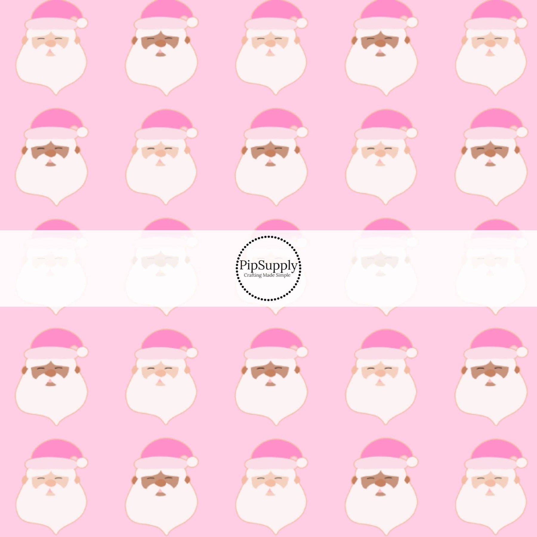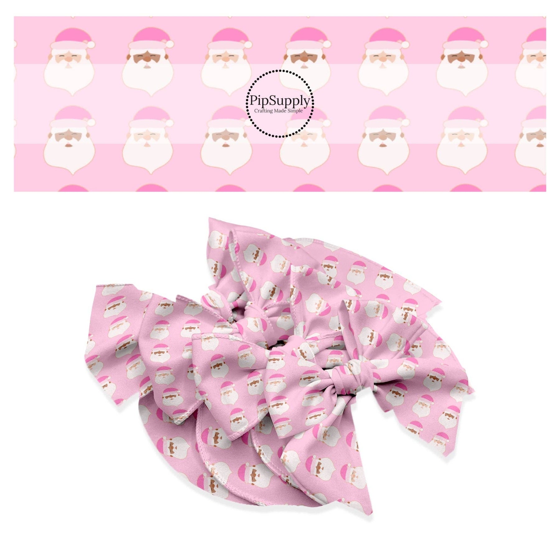 These holiday pattern themed no sew bow strips can be easily tied and attached to a clip for a finished hair bow. These Christmas bow strips are great for personal use or to sell. The bow strips features Santas with pink Christmas hats on light pink.