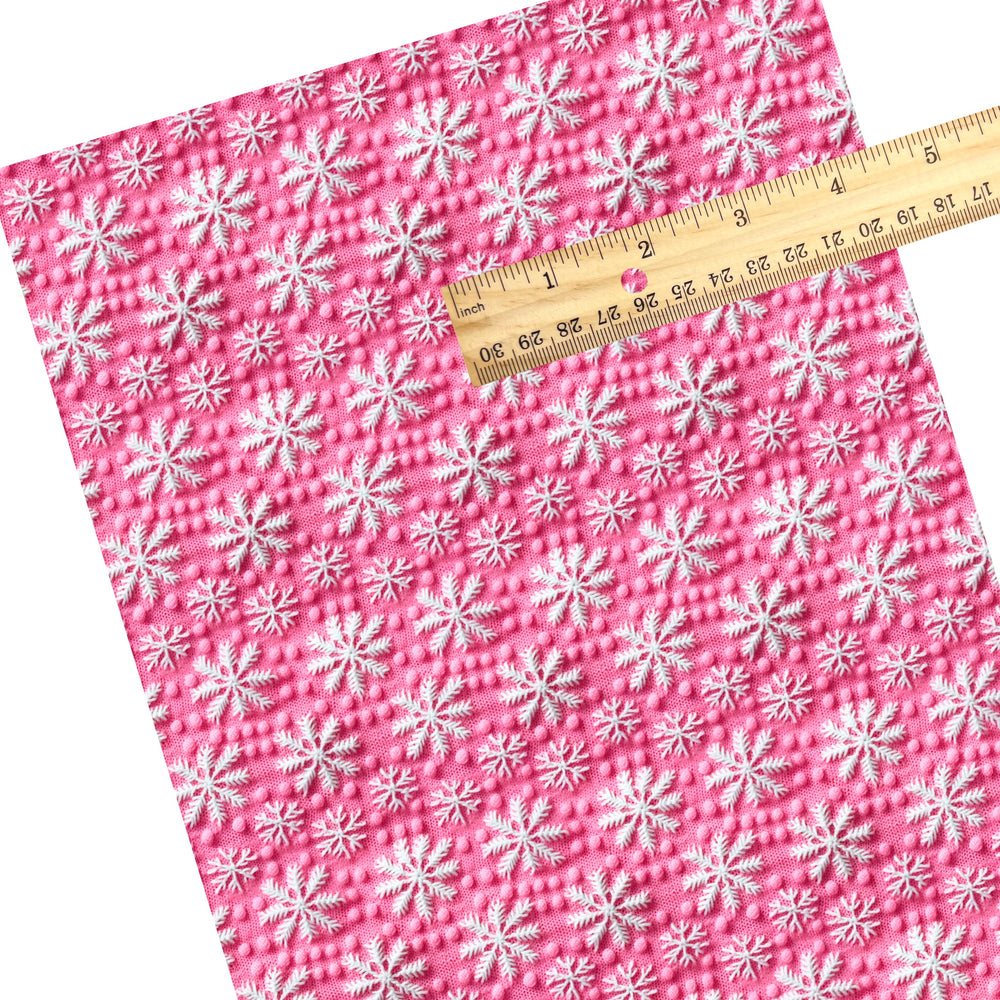 These pink snowflake faux leather sheets contain the following design elements: white snowflakes on 3D pink. Our CPSIA compliant faux leather sheets or rolls can be used for all types of crafting projects.