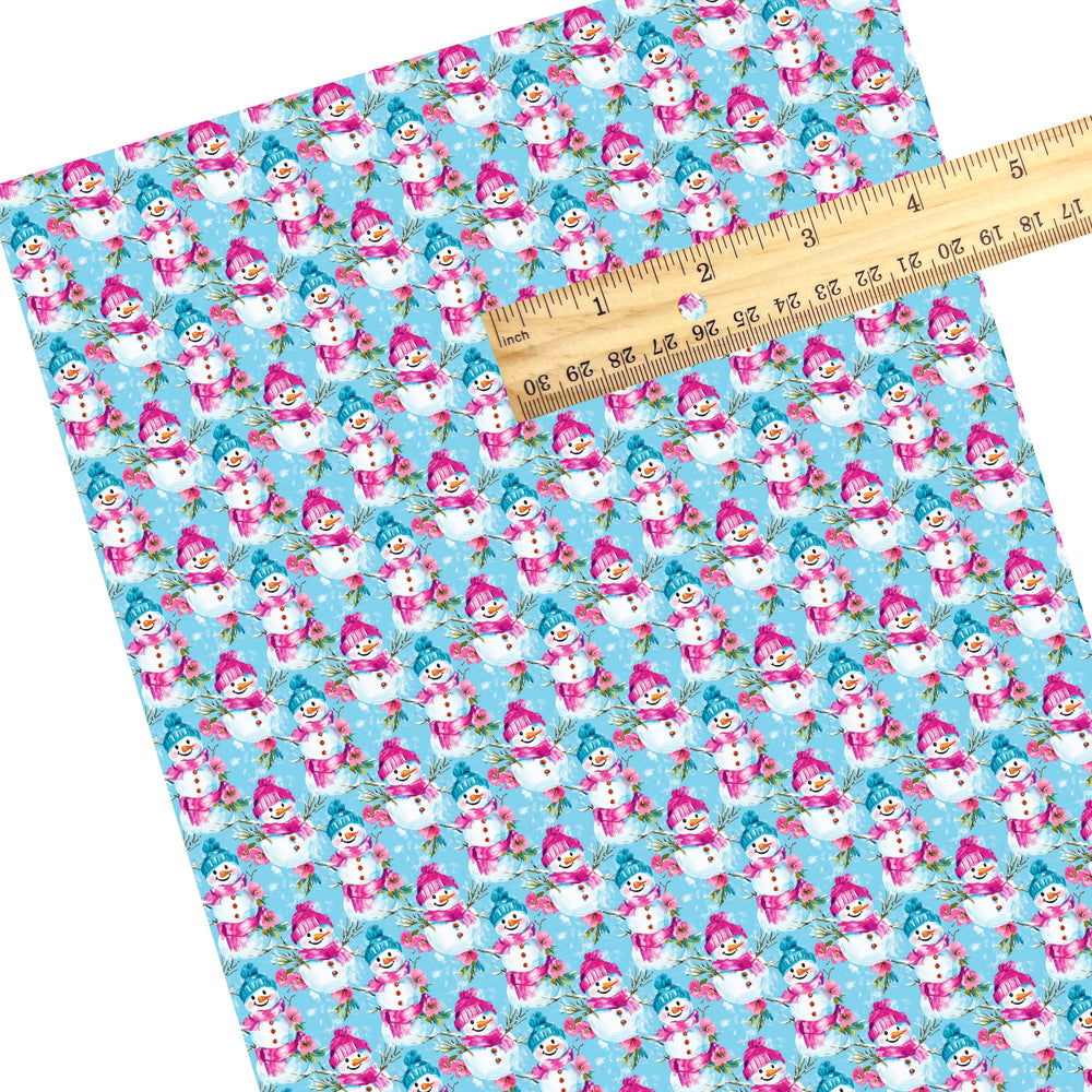 These snowman faux leather sheets contain the following design elements: blue pink multi snowman. Our CPSIA compliant faux leather sheets or rolls can be used for all types of crafting projects.