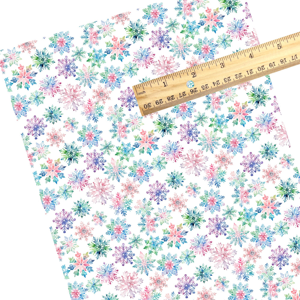 These rainbow snowflake faux leather sheets contain the following design elements: winter rainbow falling snowflakes in galaxy colors. Our CPSIA compliant faux leather sheets or rolls can be used for all types of crafting projects.