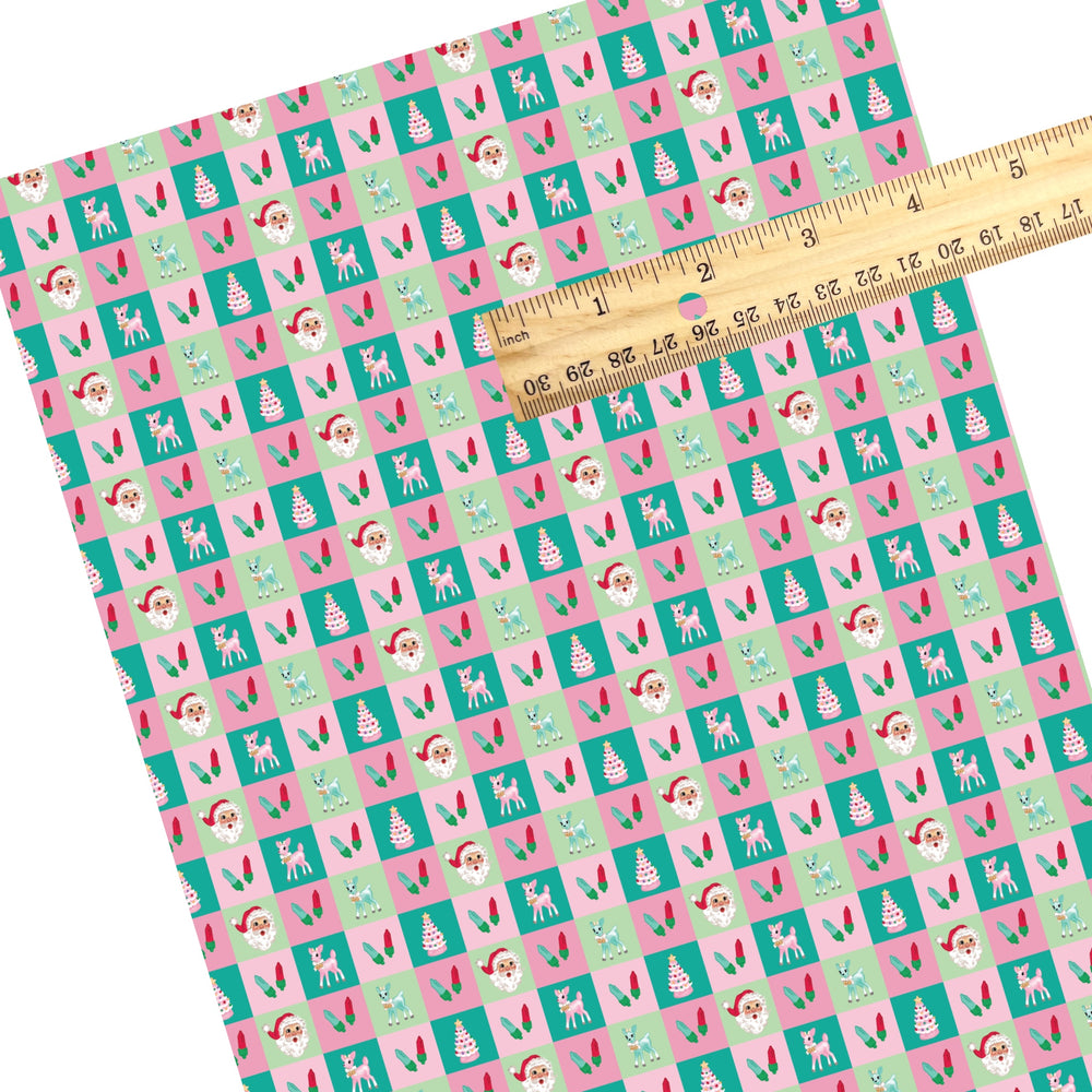 These holiday vintage style faux leather sheets contain the following design elements: Christmas vintage reindeer, presents, and holiday objects checker. Our CPSIA compliant faux leather sheets or rolls can be used for all types of crafting projects.