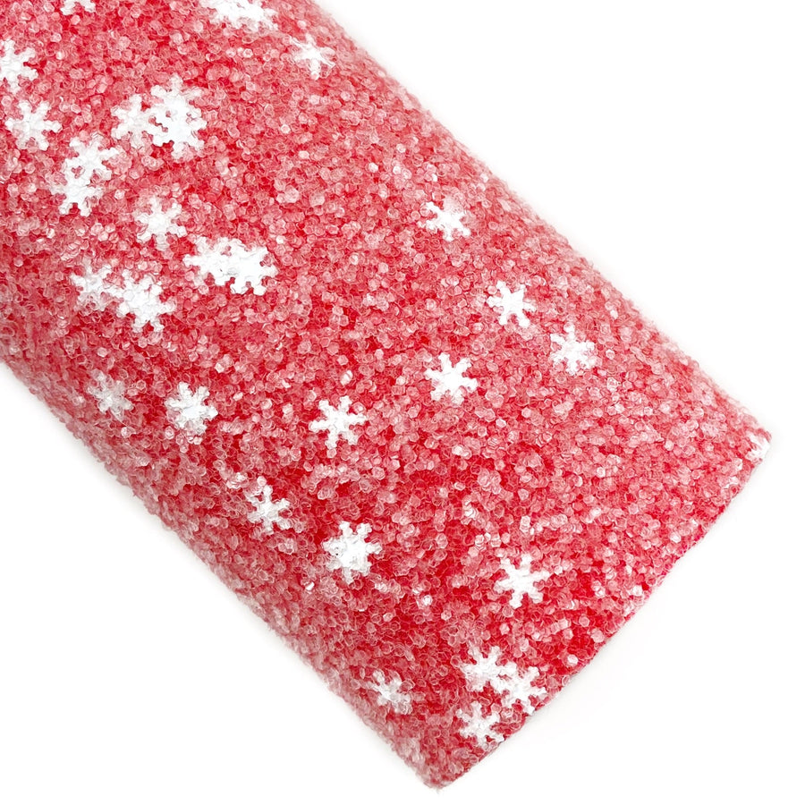 Hand sprinkled white snowflakes atop an icy clear glitter with a red base. This chunky glitter is icy and snowy!
