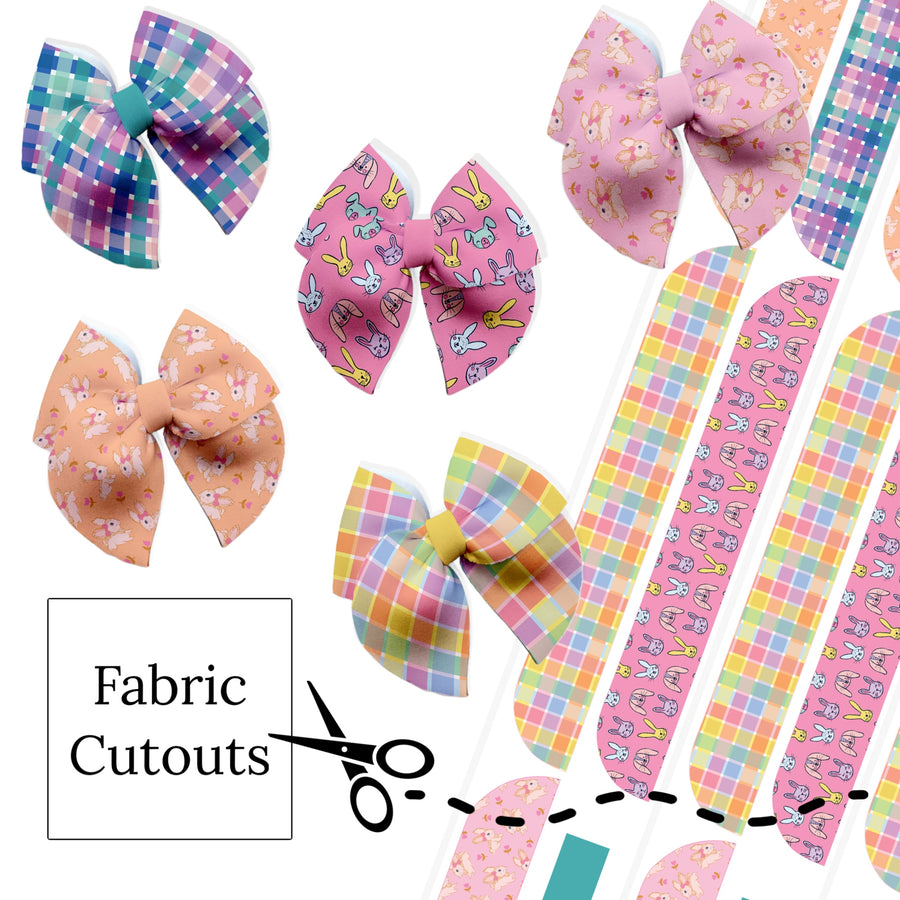 These bunny and colorful grid Easter and Spring themed neoprene sailor bows can be quickly cut and assembled for a trendy seasonal bow. They're ideal for easy at-home styling, individual use, or even resale. These bows contain designs with colorful grid patterns and bunnies. Get creative and add a splash of color to your look with these low-maintenance bows – perfect for this upcoming Spring and Easter!