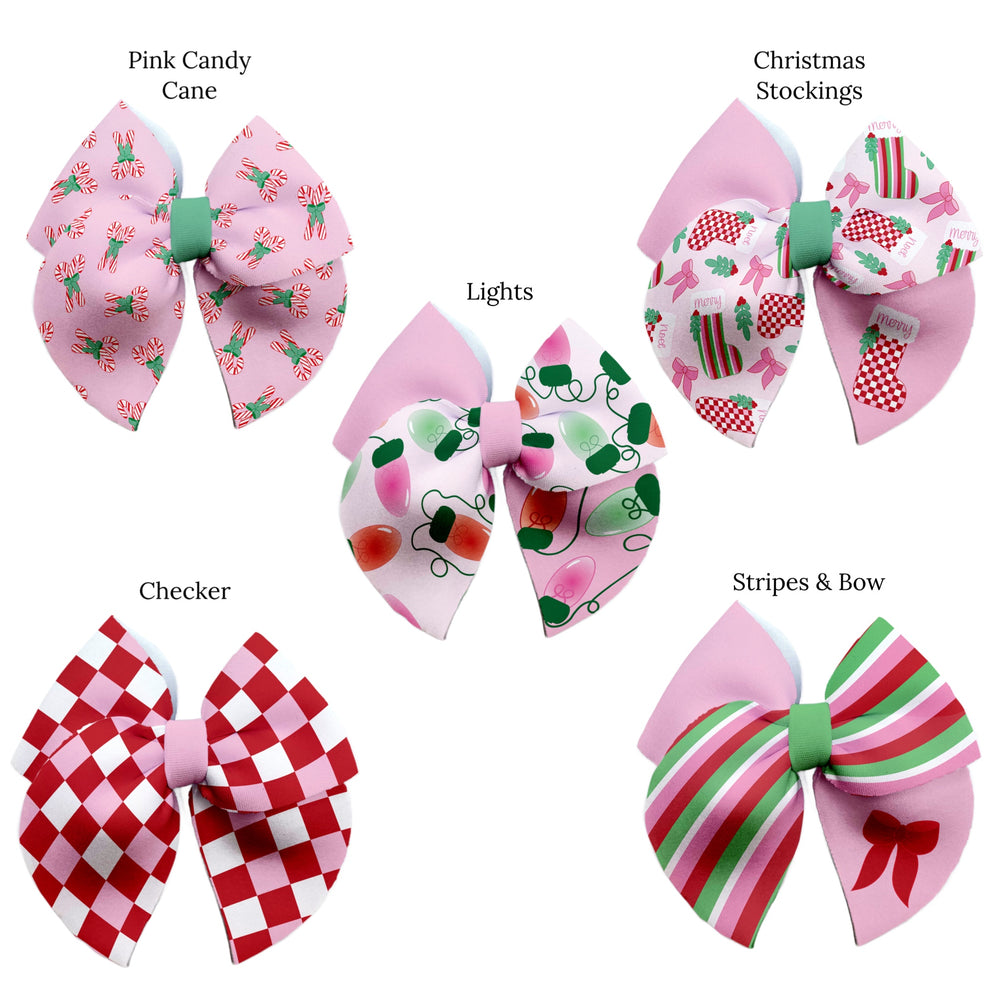 These bright pink and red Christmas neoprene sailor bows can be quickly cut and assembled for a trendy seasonal bow. They're ideal for easy at-home styling, individual use, or even resale. These bows contain checker patterns, Christmas lights, bows and candy canes. Get creative and add a splash of color to your look with these low-maintenance bows – perfect for Christmas!