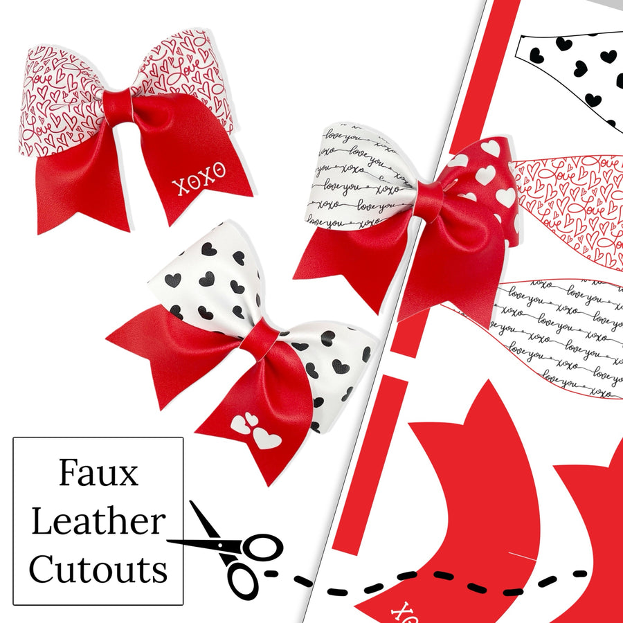 These Valentine's Day holiday themed layered faux leather bows with hearts and sayings are ready to cut and assemble for many craft projects. These patterned cutouts can be used to make a hair bow, headband, banner, photo props, scrapbook, party or classroom decorations, bulletin board trim or anything creative! You will receive one faux leather sheet with varying quantities of cutouts based on your selections. These are printed on our CPSIA compliant faux leather and will arrive to you as an uncut sheet and will need to be cut, assembled and embellished depending on your craft project. Any additional items shown are sold separately.