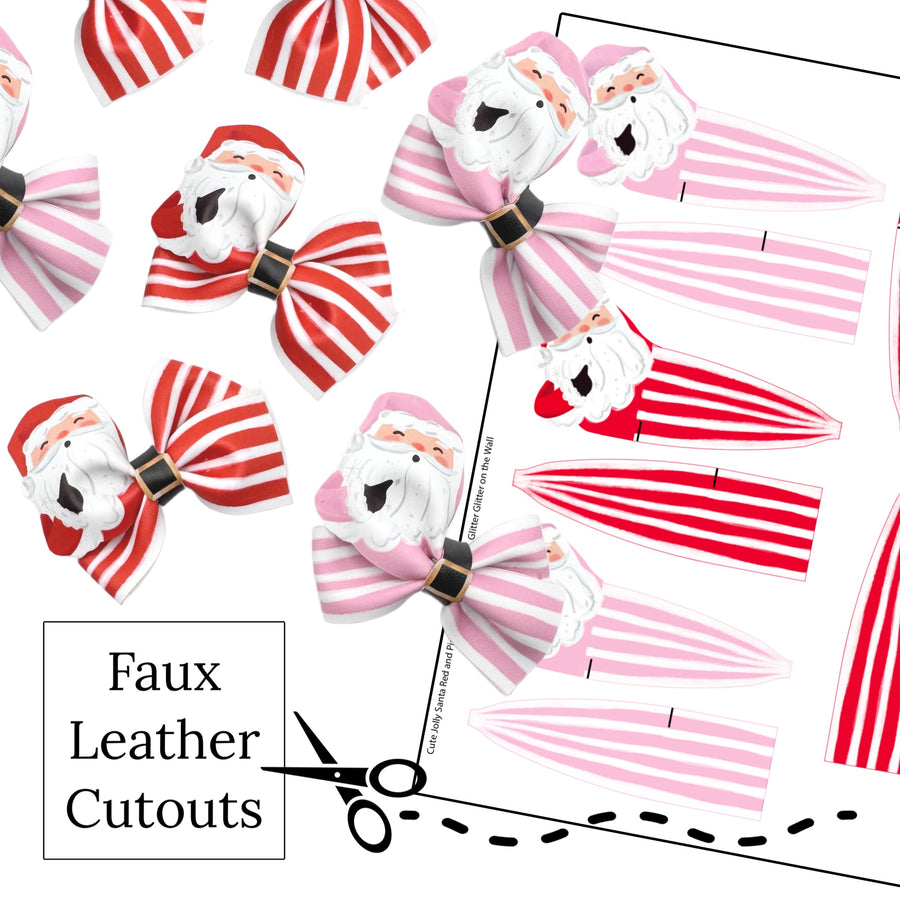 These Santa character faux leather pinwheel type bow with stripes and red and pink Santas are ready to cut and assemble for many craft projects. You will receive one faux leather sheet with varying quantities of cutouts based on your selections. These are printed on our CPSIA compliant faux leather and will arrive to you as an uncut sheet and will need to be cut, assembled and embellished depending on your craft project. Any additional items shown are sold separately.
