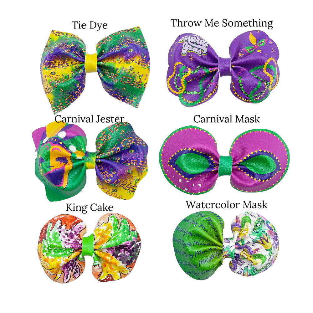 These Mardi Gras faux leather sheets are ready to cut and assemble. These patterned cutouts can be used to make a hair bow. These bow cutouts will come in either a 6 pack depending on your choice. They will arrive to you uncut and will need to be assembled and embellished depending on your craft project. Any additional items shown are sold separately.