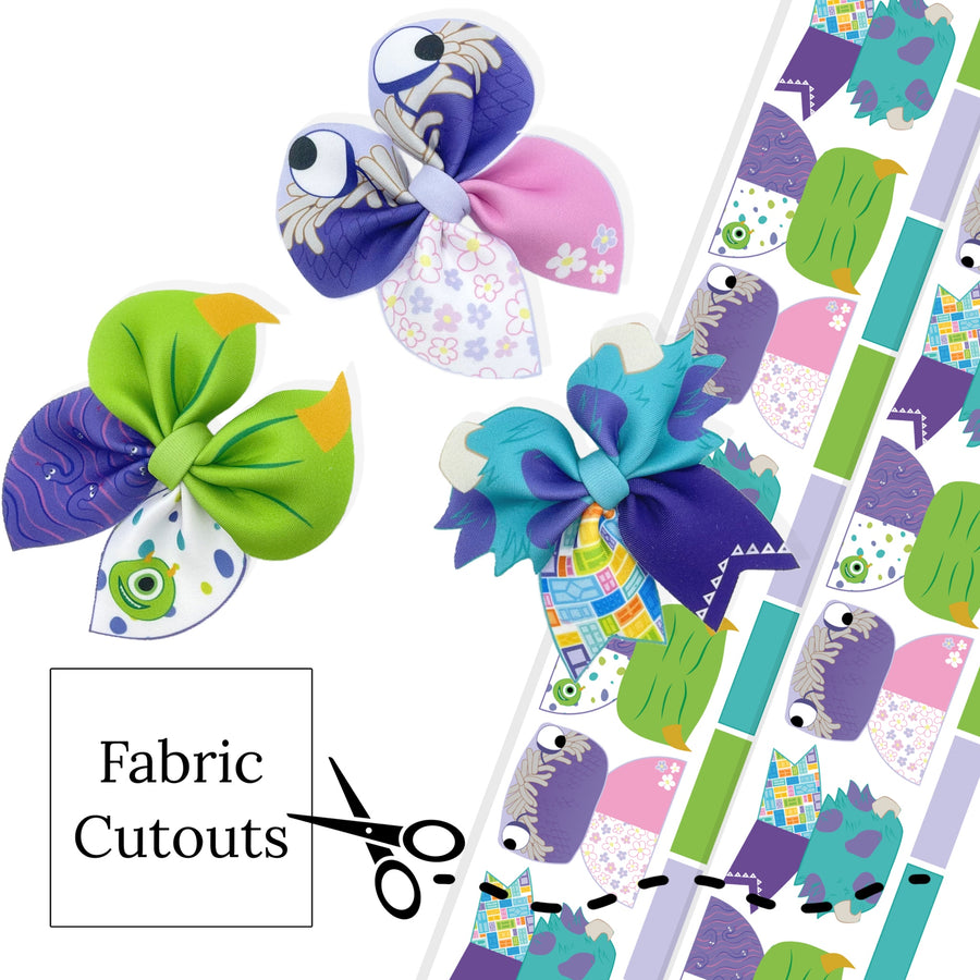 These aqua and purple monster themed neoprene bubble bows feature furry monsters, eyes, bedroom doors and flowers and can be quickly cut and assembled for a trendy bow. They're ideal for easy at-home styling, individual use, or even resale. Get creative and add a splash of color to your look with these low-maintenance bows – perfect for summer!