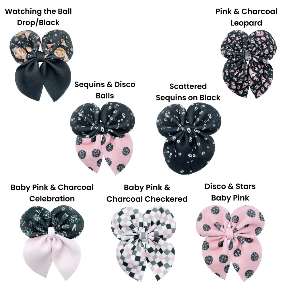 These soft, New Years themed neoprene sailor bows can be quickly cut and assembled for a trendy and cute bow. They're ideal for easy at-home styling, individual use, or even resale. These bows include leopard print, checkered, disco and other New Years themed elements. Get creative and add a splash of color to your look with these low-maintenance bows – perfect for this upcoming festive season!