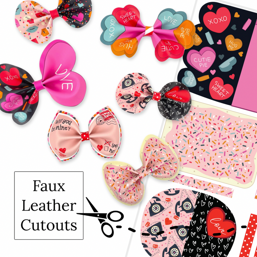 These fun holiday themed faux leather bows with hearts, candy, and treats are ready to cut and assemble for many craft projects. These patterned cutouts can be used to make a hair bow, headband, banner, photo props, scrapbook, party or classroom decorations, bulletin board trim or anything creative! You will receive one faux leather sheet with varying quantities of cutouts based on your selections. These are printed on our CPSIA compliant faux leather and will arrive to you as an uncut sheet and will need to be cut, assembled and embellished depending on your craft project. Any additional items shown are sold separately.