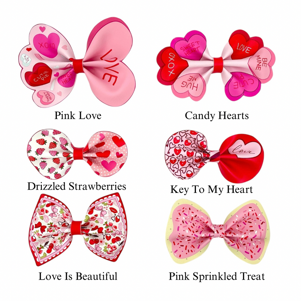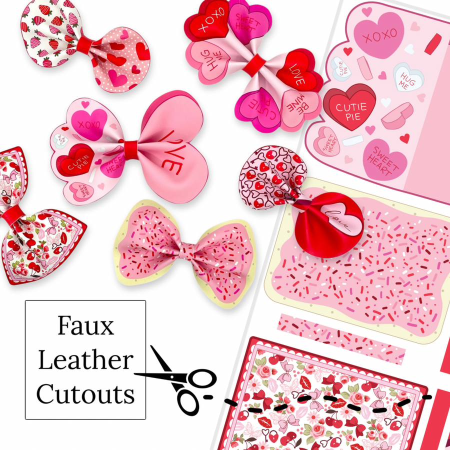 These fun holiday themed faux leather bows with hearts, candy, strawberries, and treats are ready to cut and assemble for many craft projects. These patterned cutouts can be used to make a hair bow, headband, banner, photo props, scrapbook, party or classroom decorations, bulletin board trim or anything creative! You will receive one faux leather sheet with varying quantities of cutouts based on your selections. These are printed on our CPSIA compliant faux leather and will arrive to you as an uncut sheet and will need to be cut, assembled and embellished depending on your craft project. Any additional items shown are sold separately.