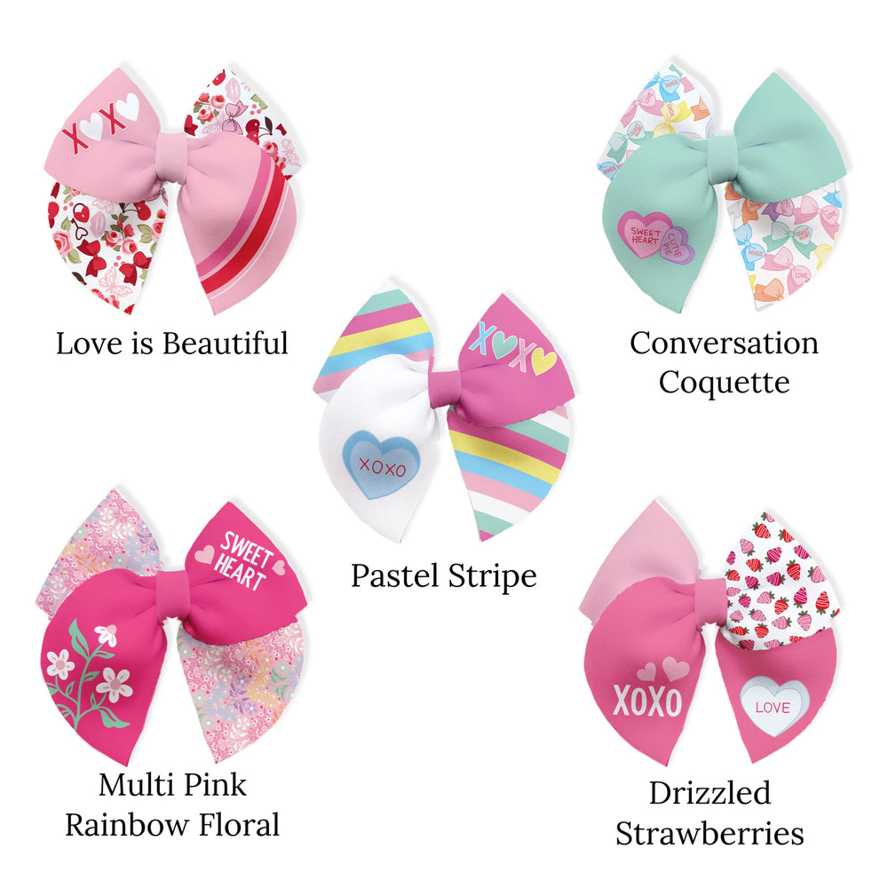 These pastel Valentine's Day neoprene sailor bows can be quickly cut and assembled for a trendy seasonal bow. They're ideal for easy at-home styling, individual use, or even resale. These bows contain pastel conversation hearts, fruit, and floral. Get creative and add a splash of color to your look with these low-maintenance bows – perfect for Valentine's Day!