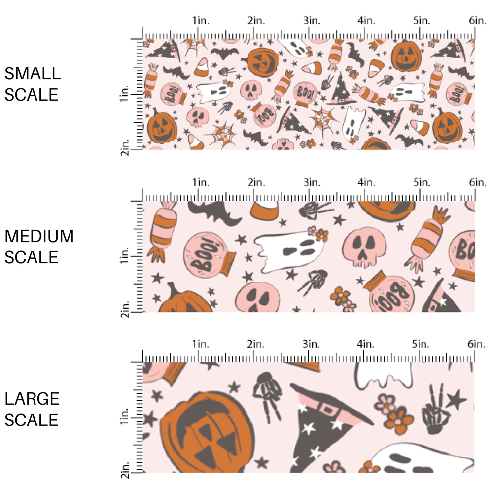 These Halloween themed light pink fabric by the yard features pumpkins, spiderwebs, ghosts, bats, skulls, candy, and tiny stars on pastel pink. This fun spooky themed fabric can be used for all your sewing and crafting needs!