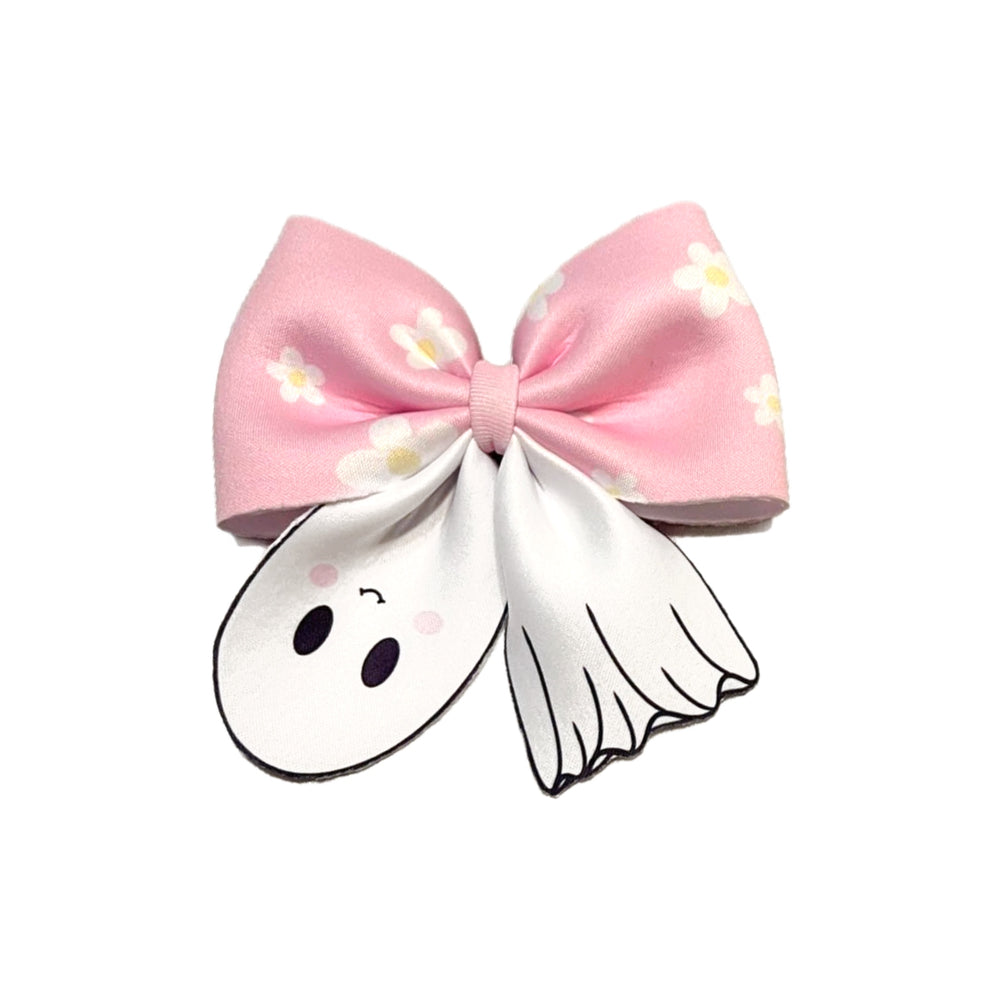 These pink and white ghost and daisy themed neoprene sailor bows can be quickly cut and assembled for a trendy seasonal bow. They're ideal for easy at-home styling, individual use, or even resale. These bows contain white and pink flowers and ghost bow tails. Get creative and add a splash of color to your look with these low-maintenance bows – perfect for Halloween!