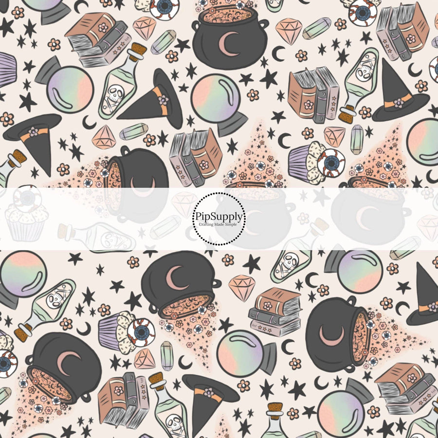 Witches Cauldron and Spells on Bone White Hair Bow Strips