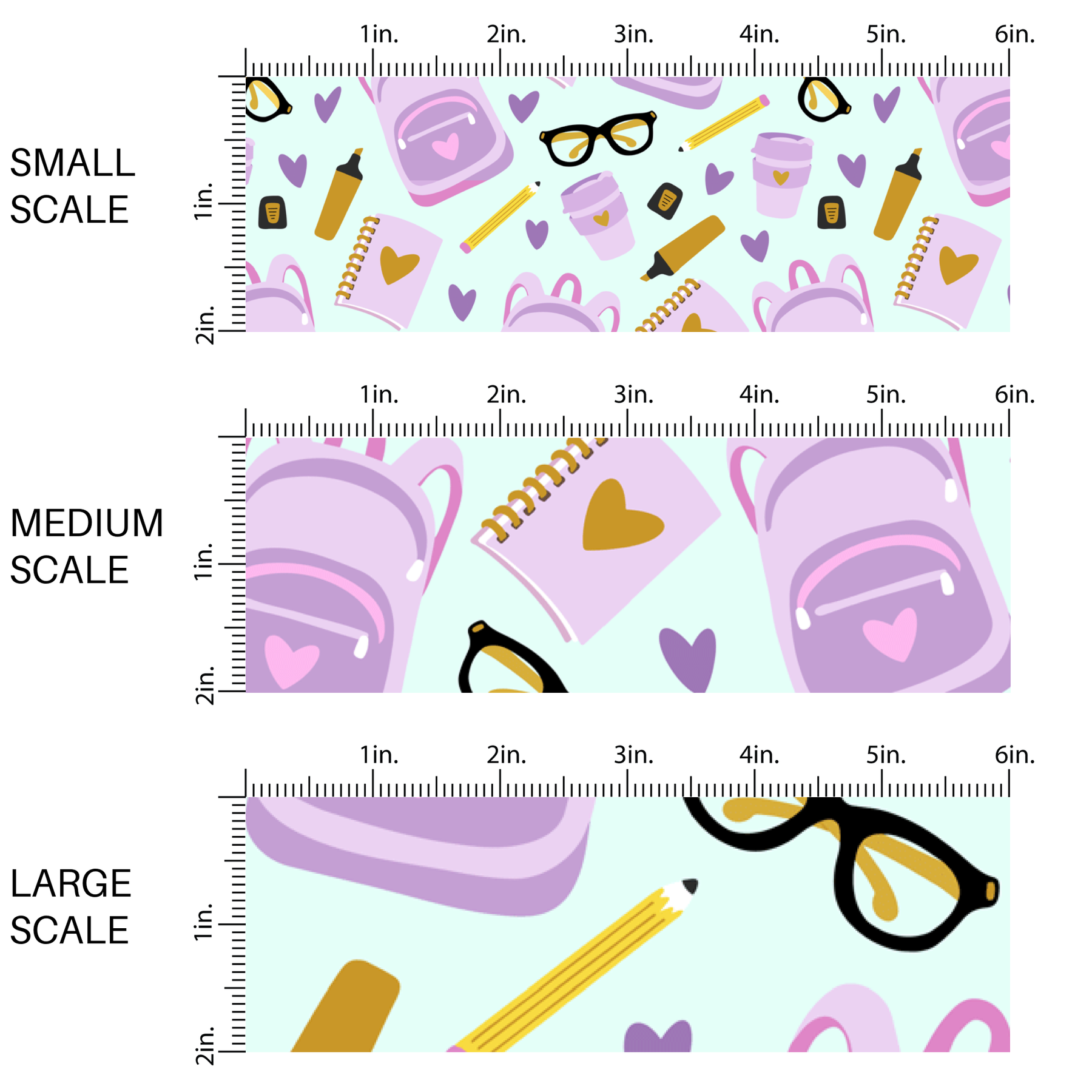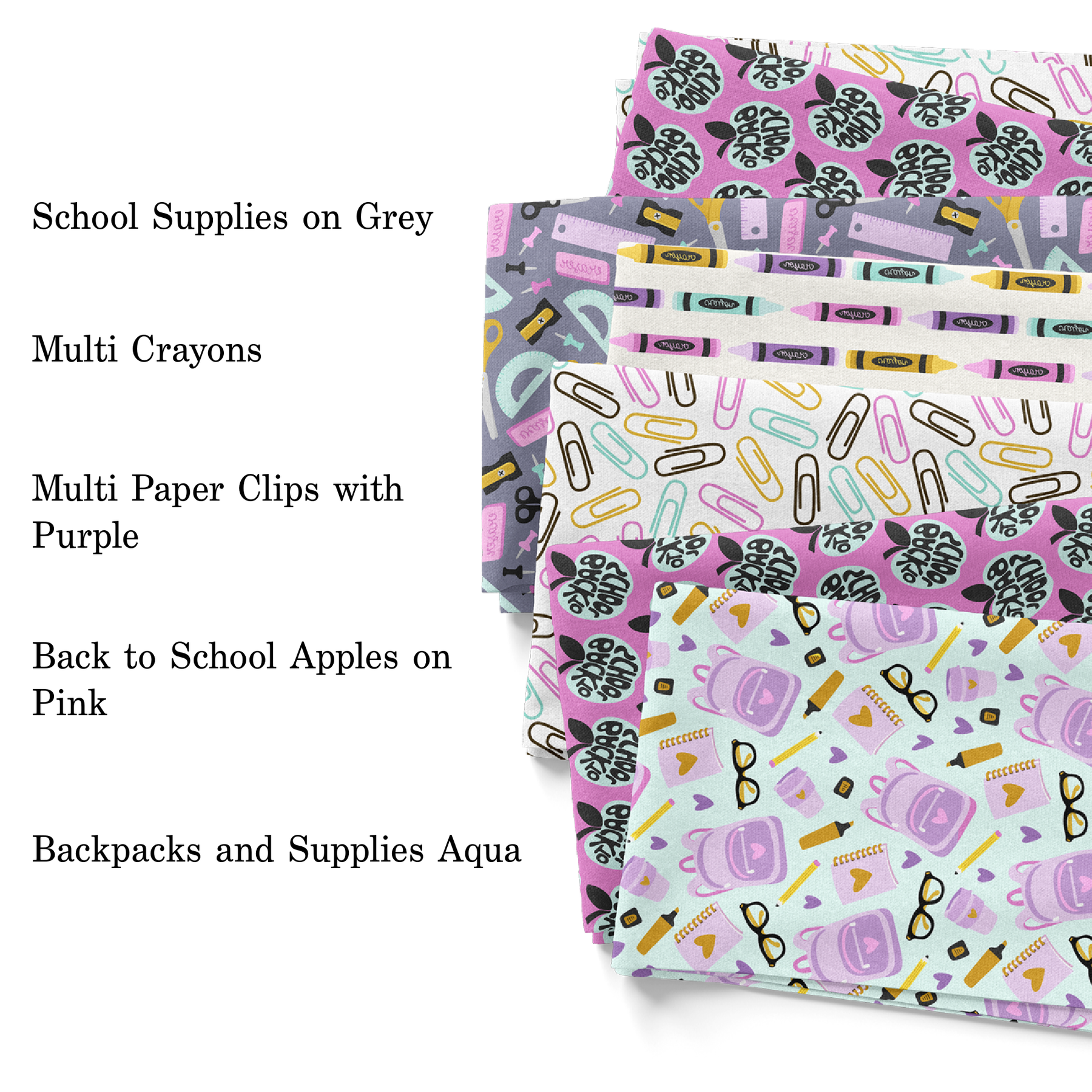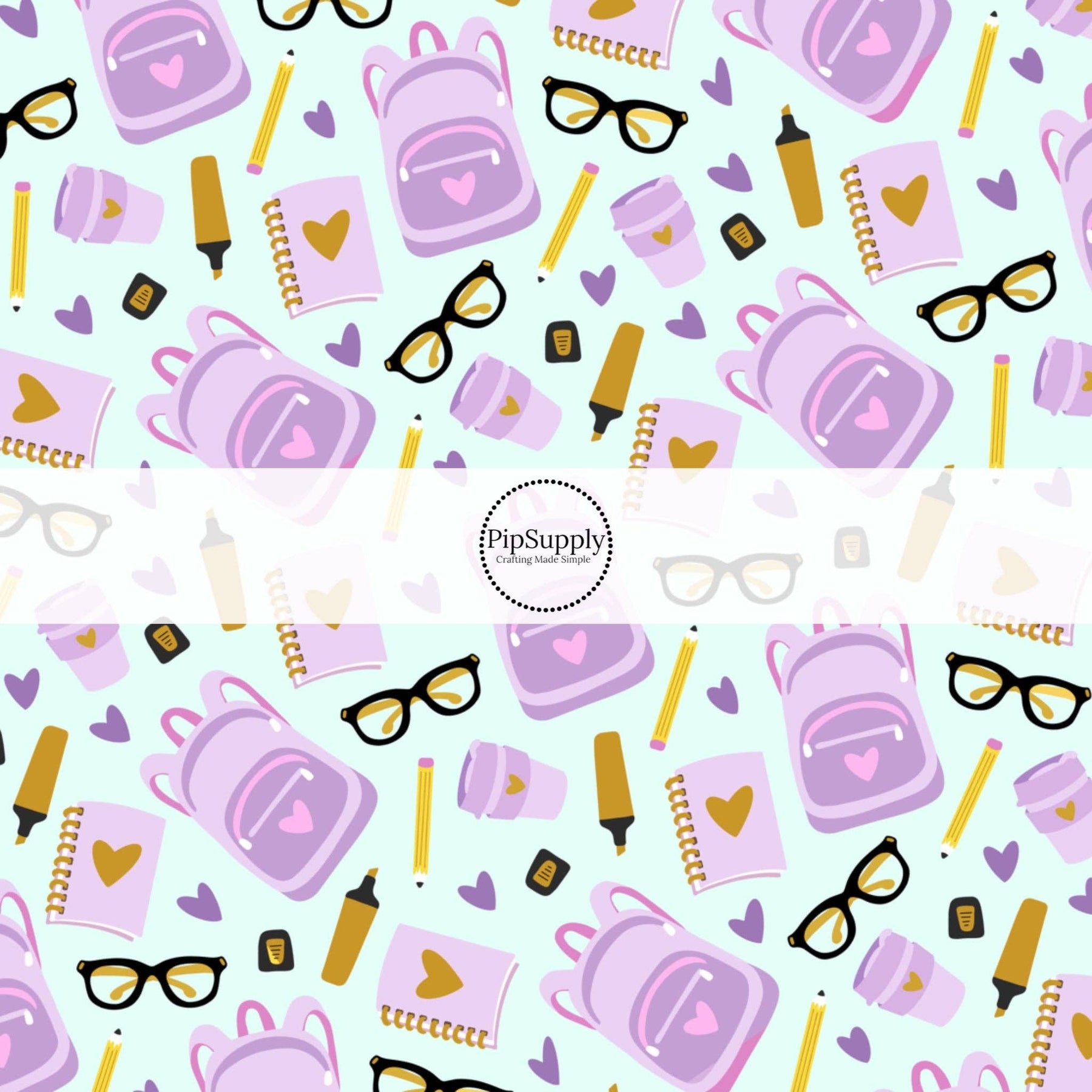 This aqua fabric by the yard features purple school supplies, yellow, pencils, and hearts. This fun school themed fabric can be used for all your sewing and crafting needs!