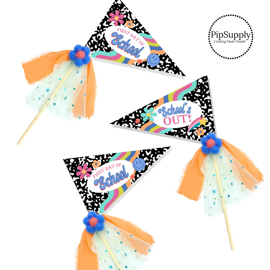 Commemorate the first and last day of school with this flag pennant designed to look like a composition book. Capture school year memories with this photo prop that is printed on our CPSIA compliant premium faux leather.