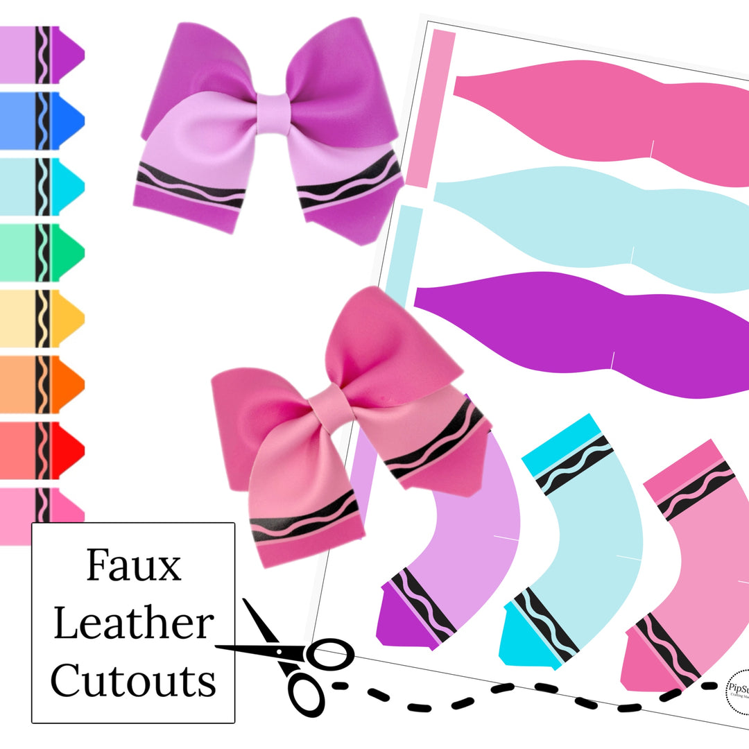 These school themed faux leather twirl bows with colorful crayons are ready to cut and assemble for many craft projects. These patterned cutouts can be used to make a hair bow, headband, banner, photo props, scrapbook, party or classroom decorations, bulletin board trim or anything creative! You will receive one faux leather sheet with varying quantities of cutouts based on your selections. These are printed on our CPSIA compliant faux leather and will arrive to you as an uncut sheet and will need to be cut, assembled and embellished depending on your craft project. Any additional items shown are sold separately.