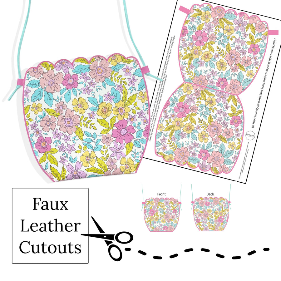These pastel blue and pink flowers faux leather sheets are ready to cut and assemble for a faux leather purse. You will receive one printed sheet which when cut, gives you a front and back side. This kit also includes 1 yard of coordinating faux suede cord. It will arrive flat and uncut and you will need to cut and assemble to make the finished product. The sheets are printed on our CPSIA compliant faux leather sheets and will arrive to you uncut and will need to assembled and embellished depending on your craft project. Any additional items shown are sold separately.