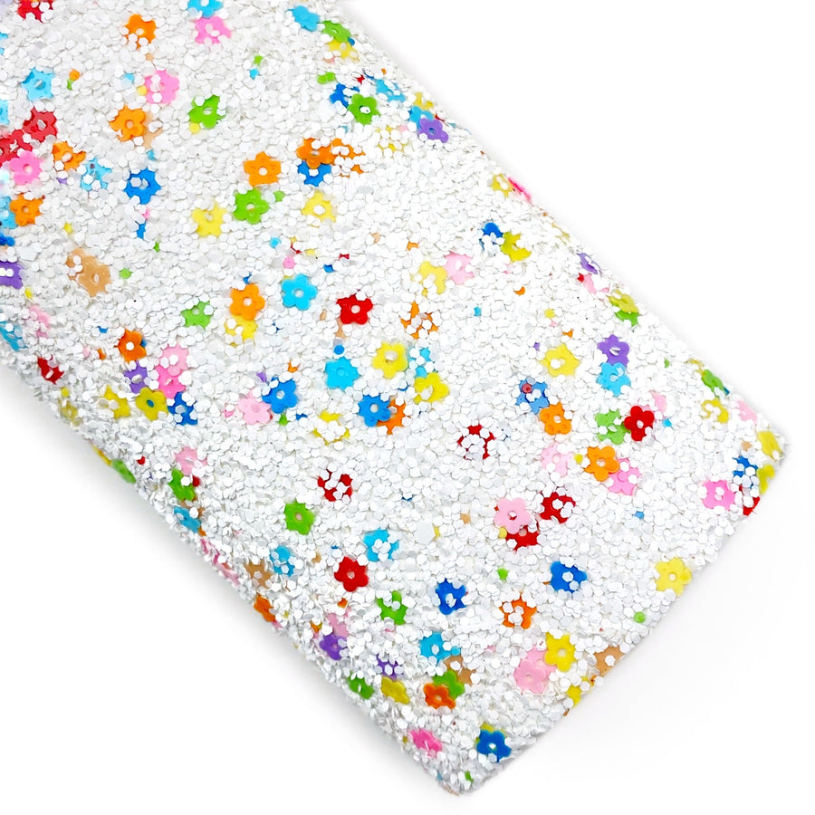 Hand sprinkled flower pieces on chunky glitter!