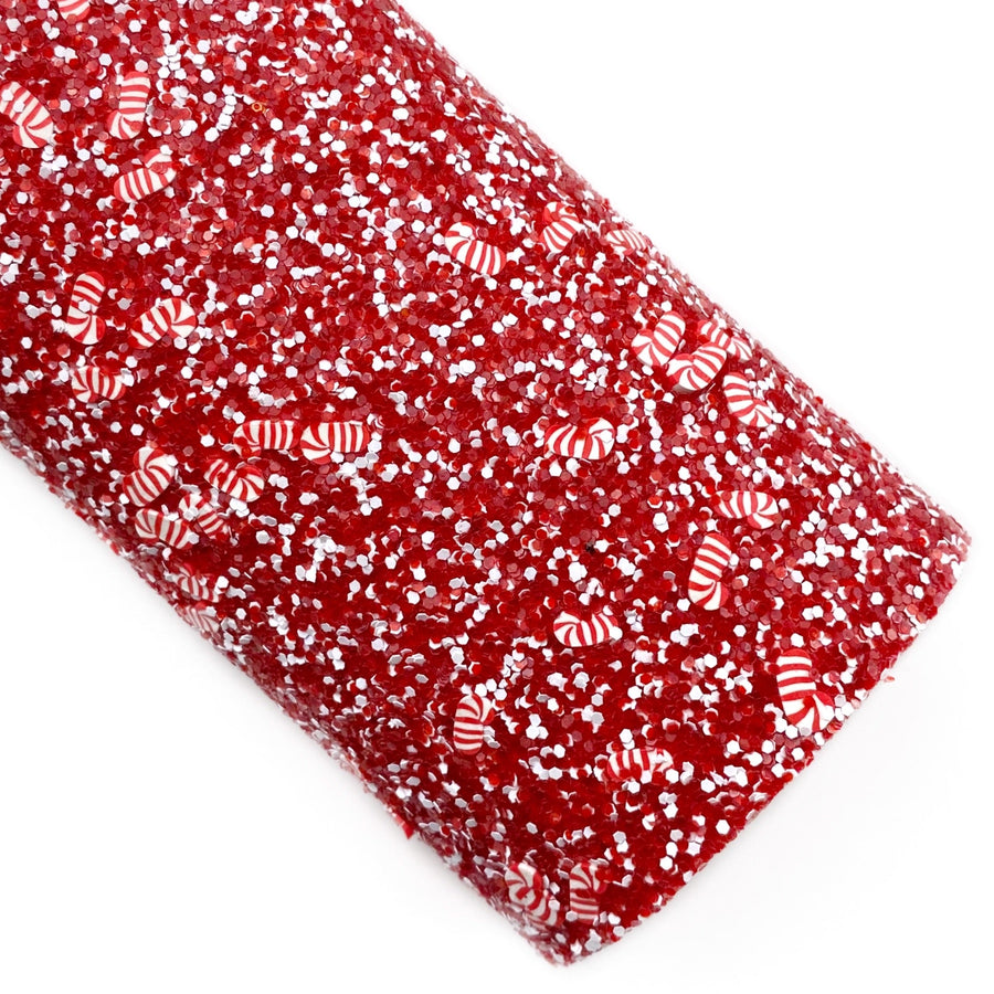 Hand sprinkled candy cane pieces on chunky glitter! The perfect traditional red and white color perfect for your holiday themed projects!