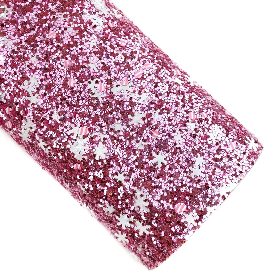 Hand sprinkled white snowflakes atop a metallic pink glitter.