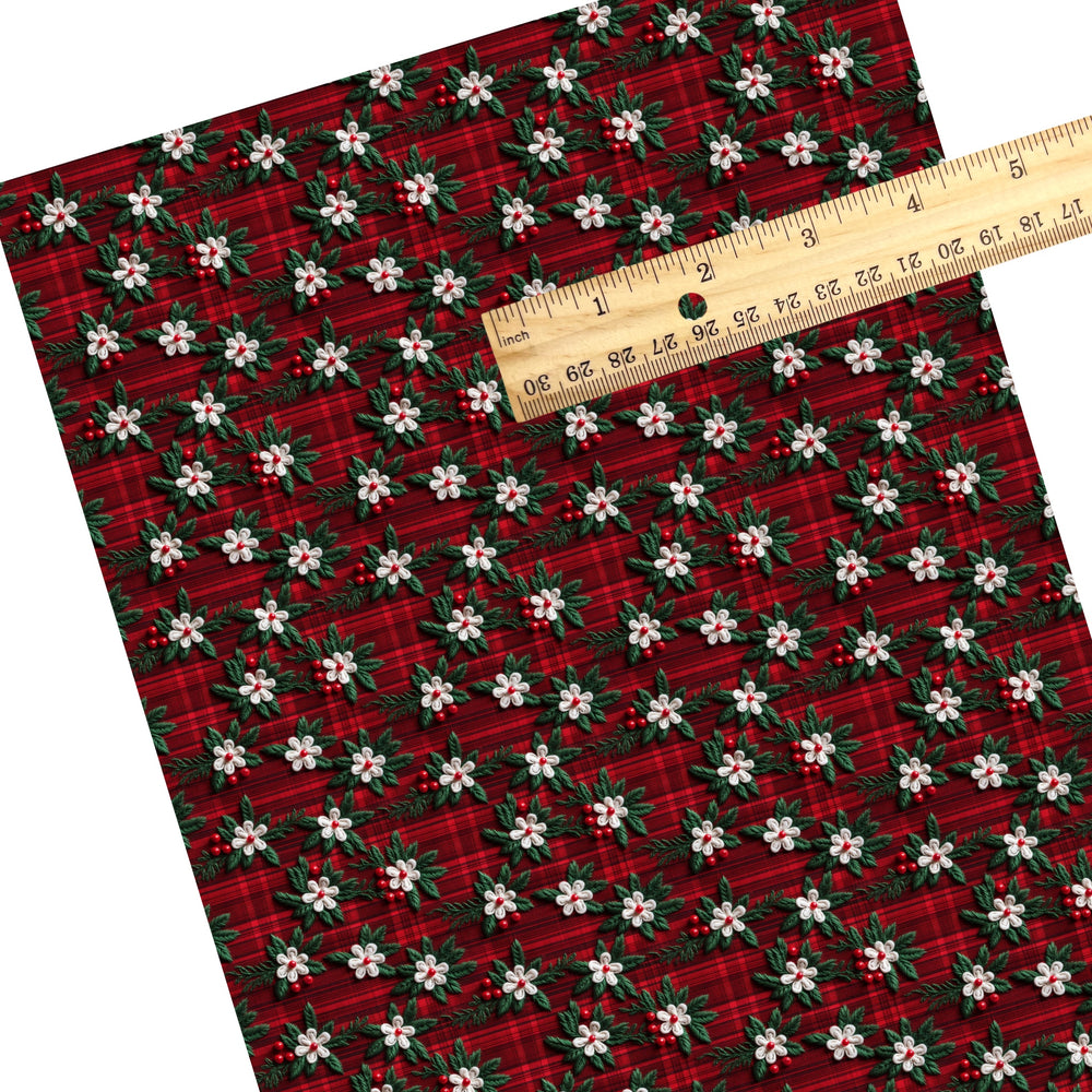These green and red multi plaid floral faux leather sheets contain the following design elements: Christmas faux embroidered flowers on gingham. Our CPSIA compliant faux leather sheets or rolls can be used for all types of crafting projects.