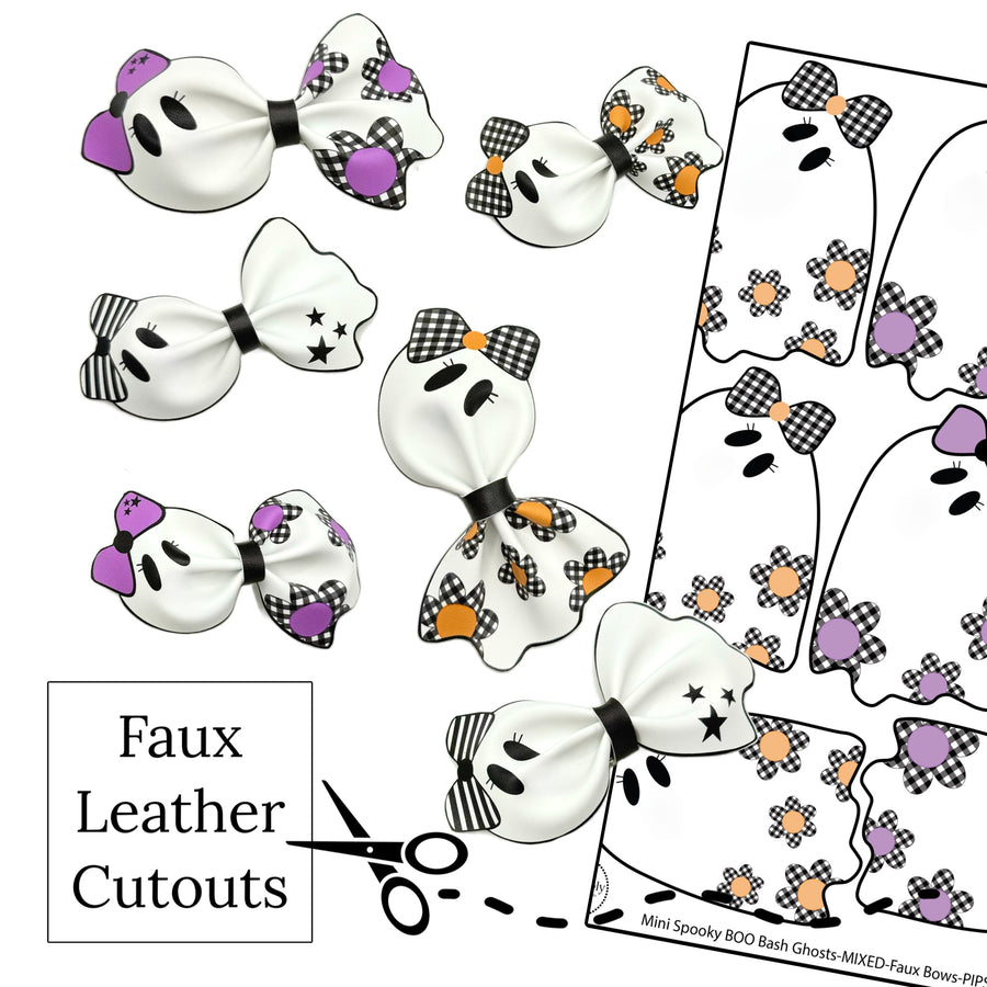 These cute ghost with bows themed faux leather bows with bows and flowers are ready to cut and assemble for many craft projects. These patterned cutouts can be used to make a hair bow, headband, banner, photo props, scrapbook, party or classroom decorations, bulletin board trim or anything creative! You will receive one faux leather sheet with varying quantities of cutouts based on your size selections. These are printed on our CPSIA compliant faux leather and will arrive to you as an uncut sheet and will need to be cut, assembled and embellished depending on your craft project. Any additional items shown are sold separately.