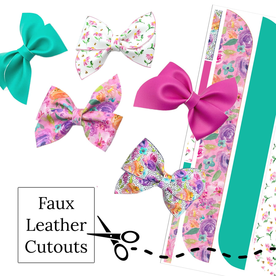 These hot pink, teal and purple solid and floral patterns for spring faux leather bows are ready to cut and assemble for many craft projects. These patterned cutouts can be used to make a hair bow, headband, banner, photo props, scrapbook, party or classroom decorations, bulletin board trim or anything creative! You will receive one faux leather sheet with varying quantities of cutouts based on your selections. These are printed on our CPSIA compliant faux leather and will arrive to you as an uncut sheet and will need to be cut, assembled and embellished depending on your craft project. Any additional items shown are sold separately.